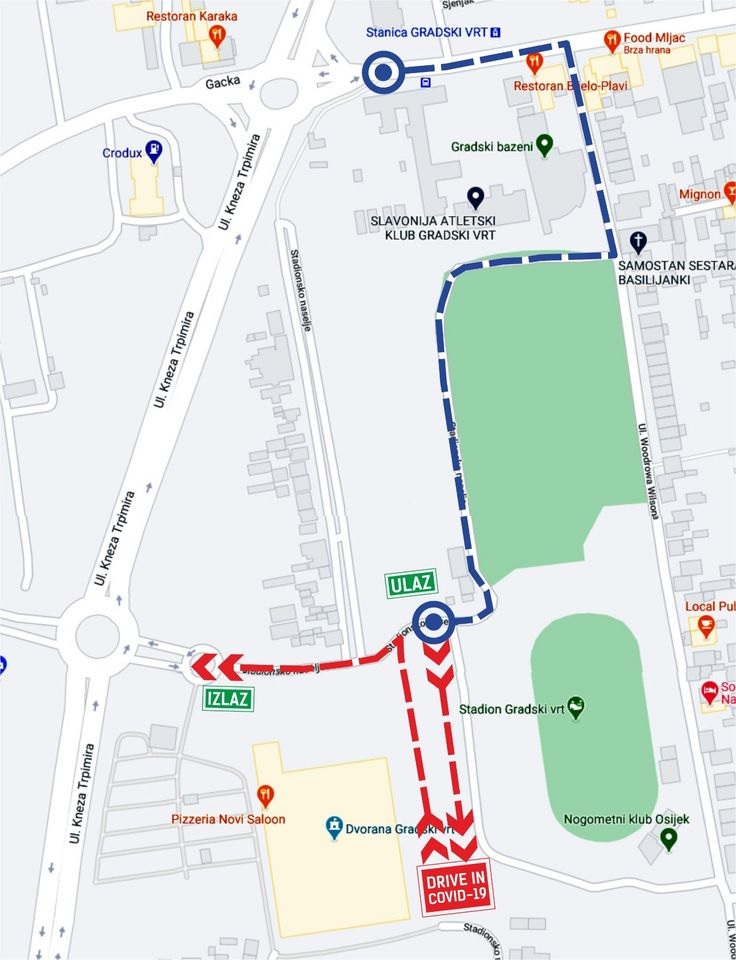 11.12.2020. Od ponedjeljka, 14. prosinca, u Osijeku počinje drive-in uzimanje uzoraka za PCR i antigensko testiranje. Ulaz automobilima je iz Wilsonove ulice kod Gradskih bazena, pa bivšom speedway stazom do istočnog ulaza br.1. (između stadiona i dvorane). Radno vrijeme je od 8.00 do 11.00 sati, a i za drive-in testiranje potrebna prethodna najava na telefonske brojeve KBC-a i Zavoda za javno zdravstvo OBŽ.